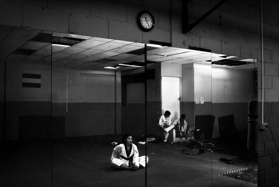 Parientes de los alumnos observan una clase de combate en el dojan de la Fesat en la Villa Olímpica, en el norte de San Salvador. Como cualquier otro deporte, sin el involucramiento de la familia en la formación del atleta, no es posible desarrollar los talentos y llegar a un alto nivel de competencia, tan necesario para llegar a los Juegos Olímpicos, donde solo clasifican 16 taekwondoístas por cada una de las cuatro categorías de peso masculinas y de las cuatro categorías femeninas. México, una potencia en América, con miles de dojan por todo el país y con un oro en Pekíni 2008 de María Espinoza, no logró ni una medalla en Londres 2012.