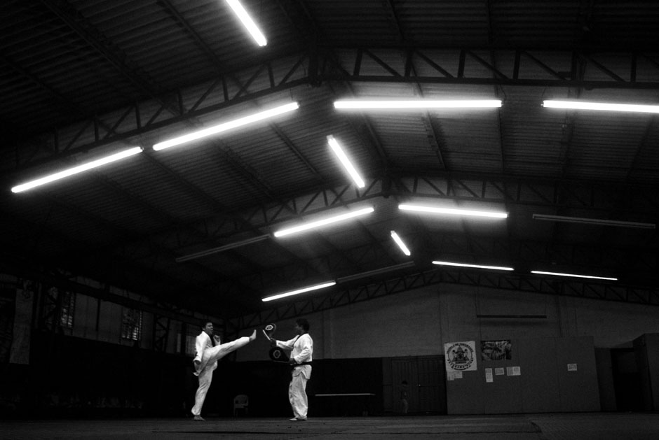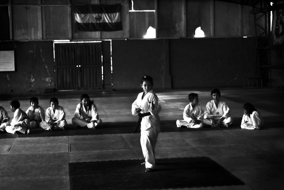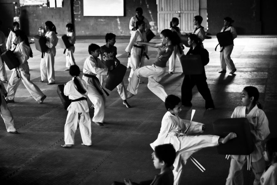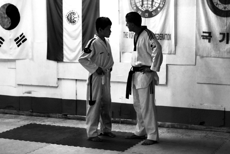 Parientes de los alumnos observan una clase de combate en el dojan de la Fesat en la Villa Olímpica, en el norte de San Salvador. Como cualquier otro deporte, sin el involucramiento de la familia en la formación del atleta, no es posible desarrollar los talentos y llegar a un alto nivel de competencia, tan necesario para llegar a los Juegos Olímpicos, donde solo clasifican 16 taekwondoístas por cada una de las cuatro categorías de peso masculinas y de las cuatro categorías femeninas. México, una potencia en América, con miles de dojan por todo el país y con un oro en Pekíni 2008 de María Espinoza, no logró ni una medalla en Londres 2012.
